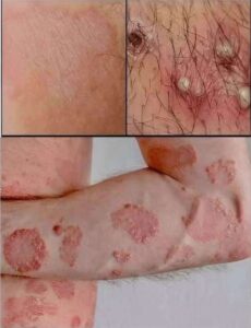 • Red, scaly patches with raised edges