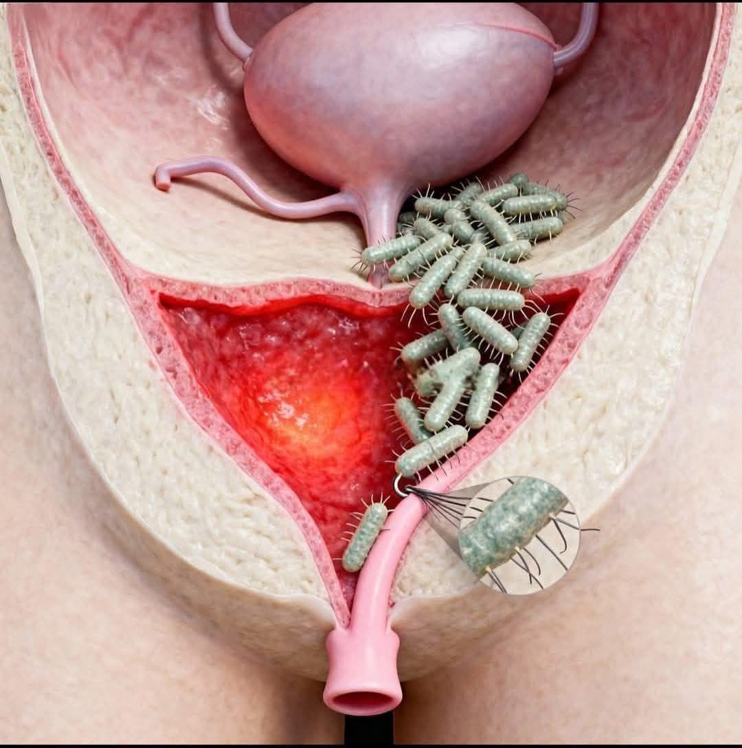 La imagen lo muestra sin rodeos: el trayecto por donde deberían circular solo líquidos limpios se convierte en un camino invadido. Las bacterias ascienden, se aferran, avanzan. No respetan edades, no respetan intenciones, no respetan descuidos.